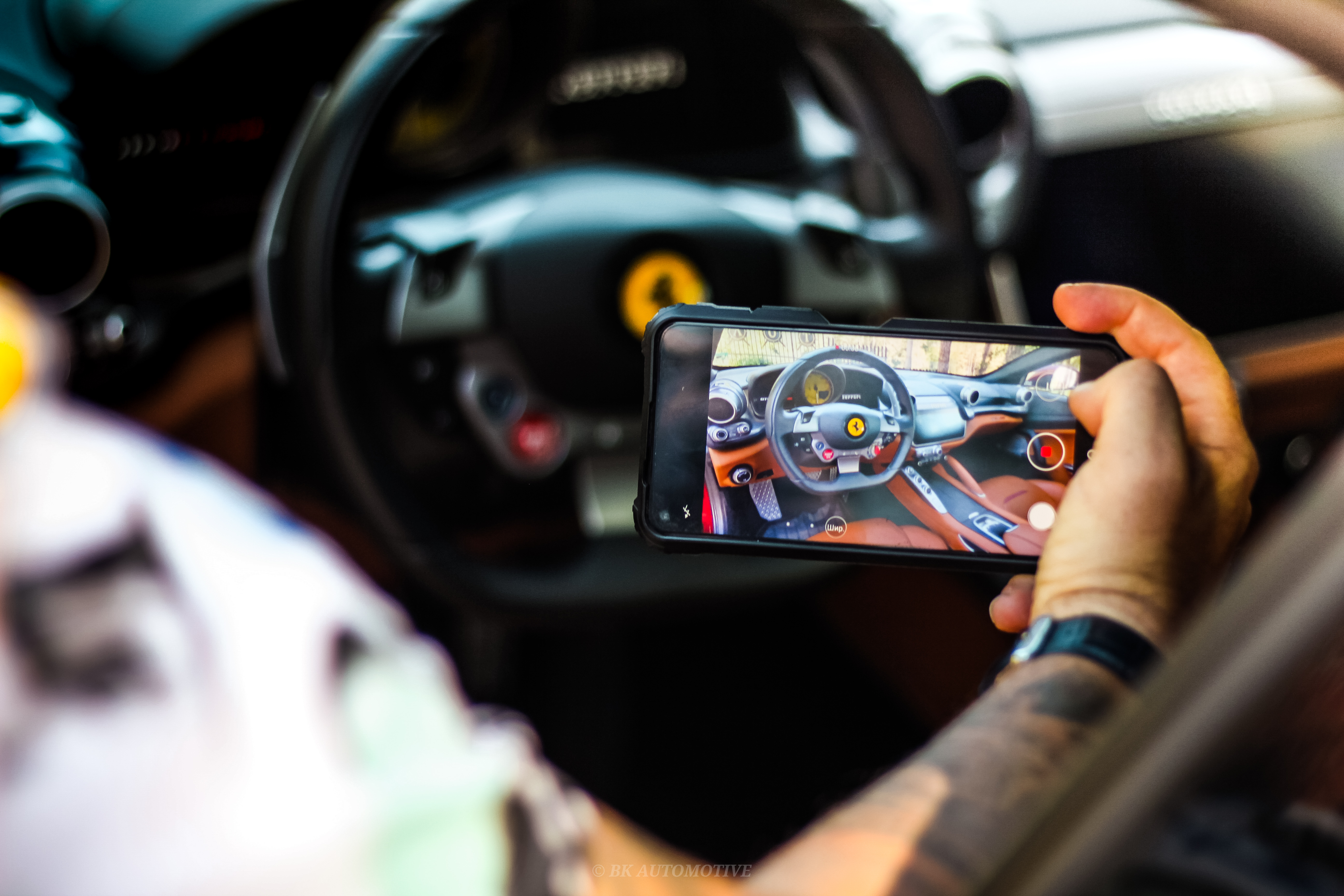 Но все пак имам някои забележки. Воланът е голям, повече бих предпочел по-малък диаметър. Ferrari обаче са го избрали в резултат на оплаквания от клиенти от този в FF. Планките за смяна на предавките са уголемени и слава Богу са на конзолата, така че не се въртят с волана. Така във всеки един момент в завоя знаете къде са. Лост за мигачи няма, заменени са от бутони на волана.